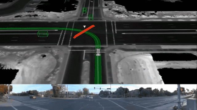 场景之一是自动驾驶汽车左转时,遇到闯红灯车辆,需识别并及时停车避让
